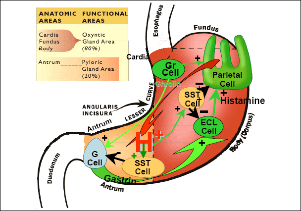 control of gastric secretion by two mechanisms (neural and hormonal) and divided into 3 phases: